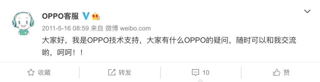 时间退回到2011年5月16日。官微@OPPO客服 发布了它“人生”的首条微博: