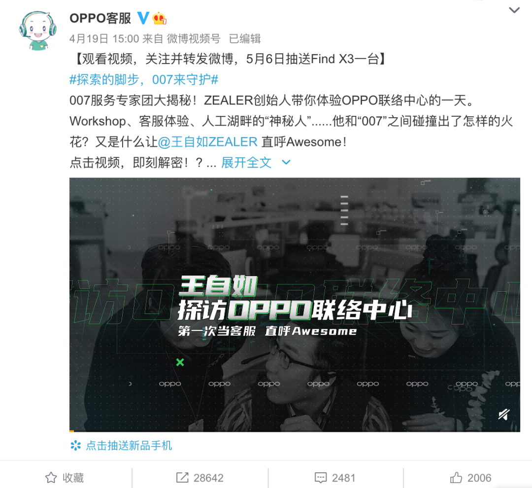而在体现客服真正的工作场景时,项目正是把开篇提到的那条微博,邀请KOL王自如到OPPO客服中心进行体验和展示,以一个综艺感的Vlog的形式,传递OPPO客服工作的点点滴滴。这里正是通过KOL的吸引力与内容呈现,将客服的专业性与多元鲜活的面貌展示给用户。