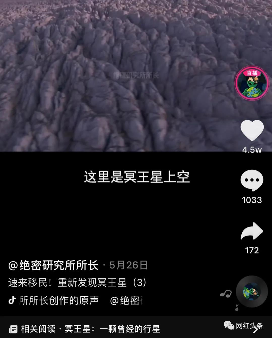 在2021年5月26日,该账号发布了选题为"速来移民!重新发现冥王星"的视频内容。