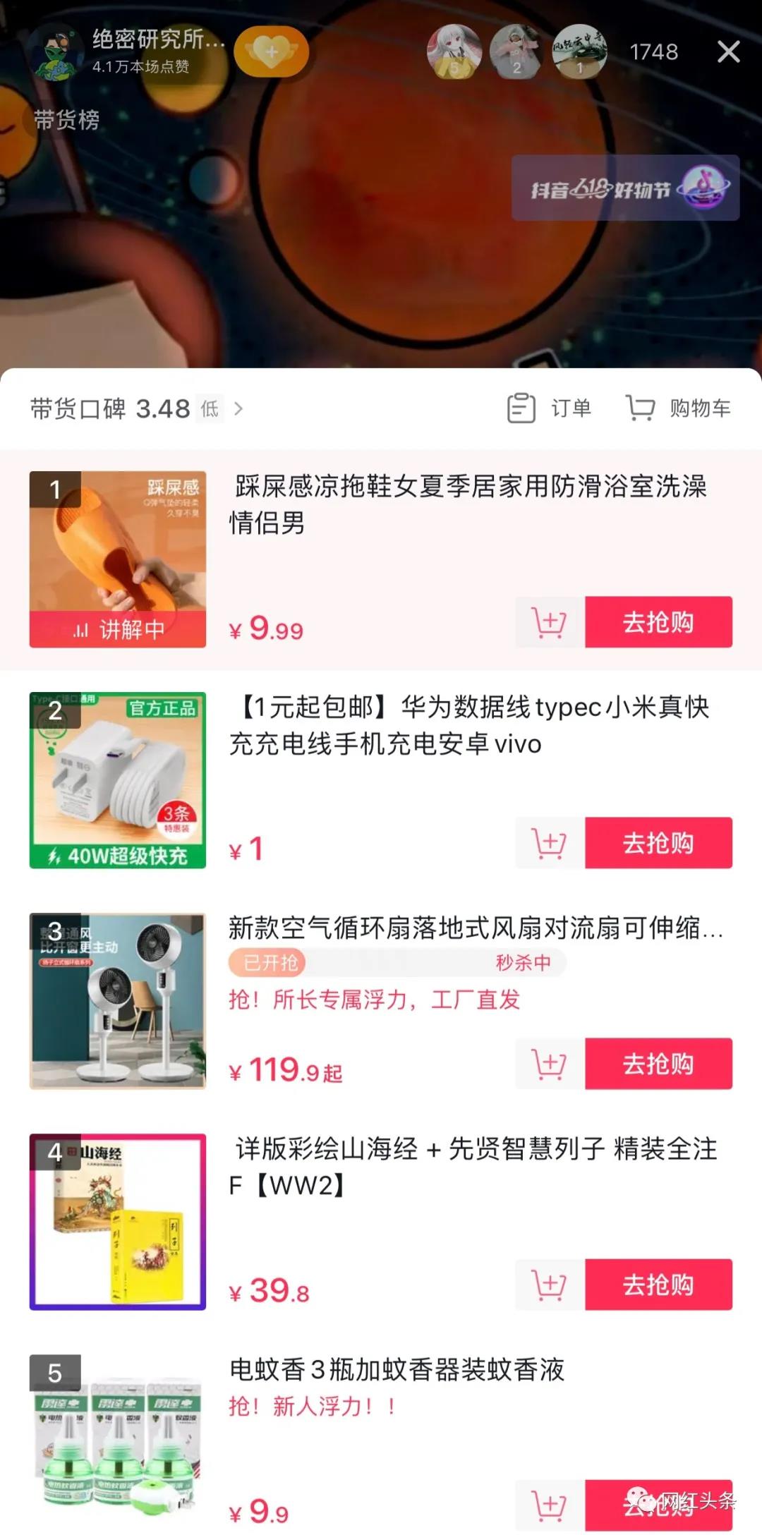 从拖鞋、数据线、电风扇、电蚊香等都有涉及,该账号直播带货所考虑的都是一些低客单价的产品,这样的好处就是可以减少用户的下单决策成本。