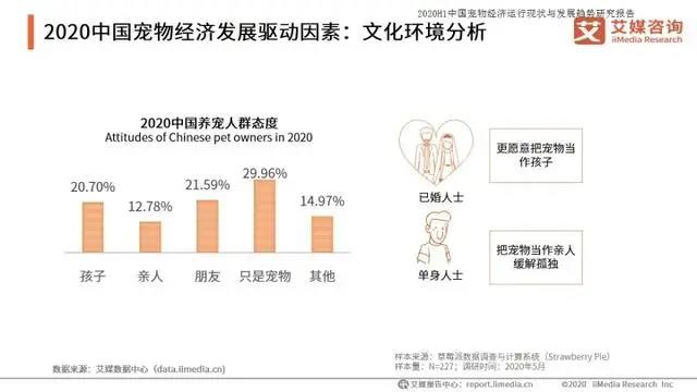 根据2020年最新的研究报告,已经有超过50%的宠物主将宠物视为自己的孩子、亲人、朋友,也有已婚人士更愿意把宠物当作自己的孩子,值得一提的是,单身人士把宠物当作亲人来缓解孤独。