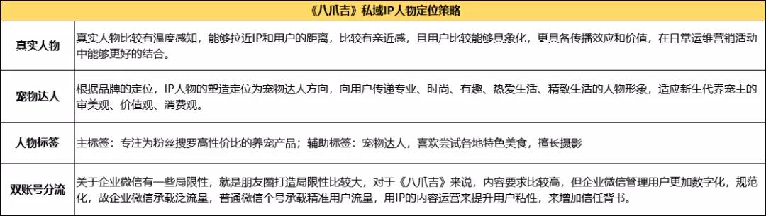 因为宠物垂类的IP打造不同于其他消费品,更加注重价值观、审美观、养宠消费观的输出,YY一件在针对八爪吉品牌定位做了画布分析以及用户画像的剖析之后,比如这个私域IP的关键业务、价值因素、选择因素、用户画像、渠道来源、竞品分析、优势分析、重要合作等方面,以【内容营销+知识科普+话题事件+社交互动】的传播形式,来引流变现并实现线上多渠道购买转化,实现品牌的用户价值,同时增强品牌影响力。因此,以“宠姐姐”这样亲民的昵称作为私域IP名称再好不过了。