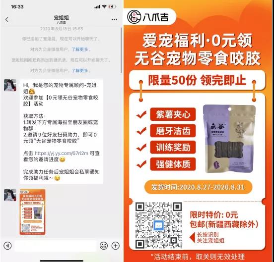 这是因为,微信把每个用户的社交关系都沉淀下来,所以通常用户是很难离开微信的,企业微信则可以结合一件SCRM工具设置活动,通过每个宠物主人的朋友圈、社群裂变获得更多的用户加入私域流量。