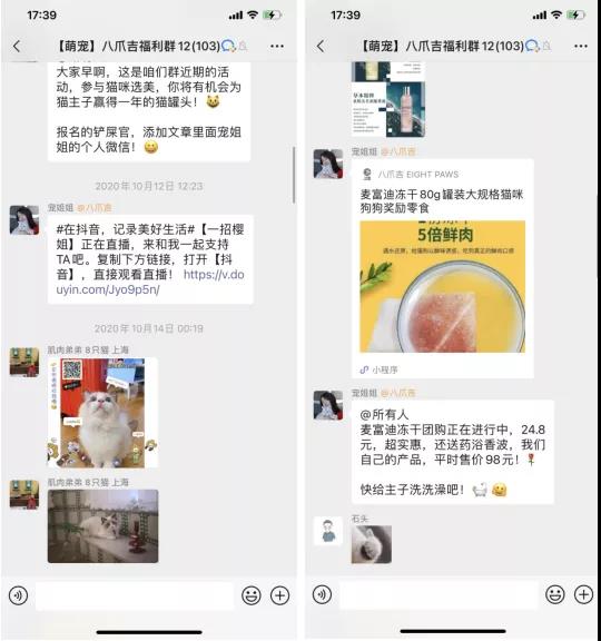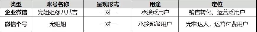 另一方面,企业微信号“宠姐姐@八爪吉”因为自带企业品牌标识,对于泛用户来说有一个直观的品牌意识和专业辨识度,适合直接销售转化;而微信个号,则是对超级用户的VIP运营,定位为宠物达人。