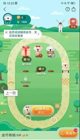 辅助玩法:考拉跑圈获得按树叶加速升级,每个等级考拉按树叶收集量不一样,等级越高收集按树叶越多,同时考拉按树叶收集限制离线收集时长,避免收集过快乐园生态虚拟金币通货膨胀。