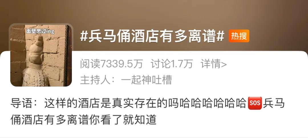 根据微博实时热搜显示,"景区雪糕大战是文创界内卷吗""兵马俑也忍不住出雪糕了"等有关文创雪糕的热搜就有十几条。而有关#兵马俑酒店有多离谱#的话题也在微博上拥有7339.5万阅读量和1.7万讨论。