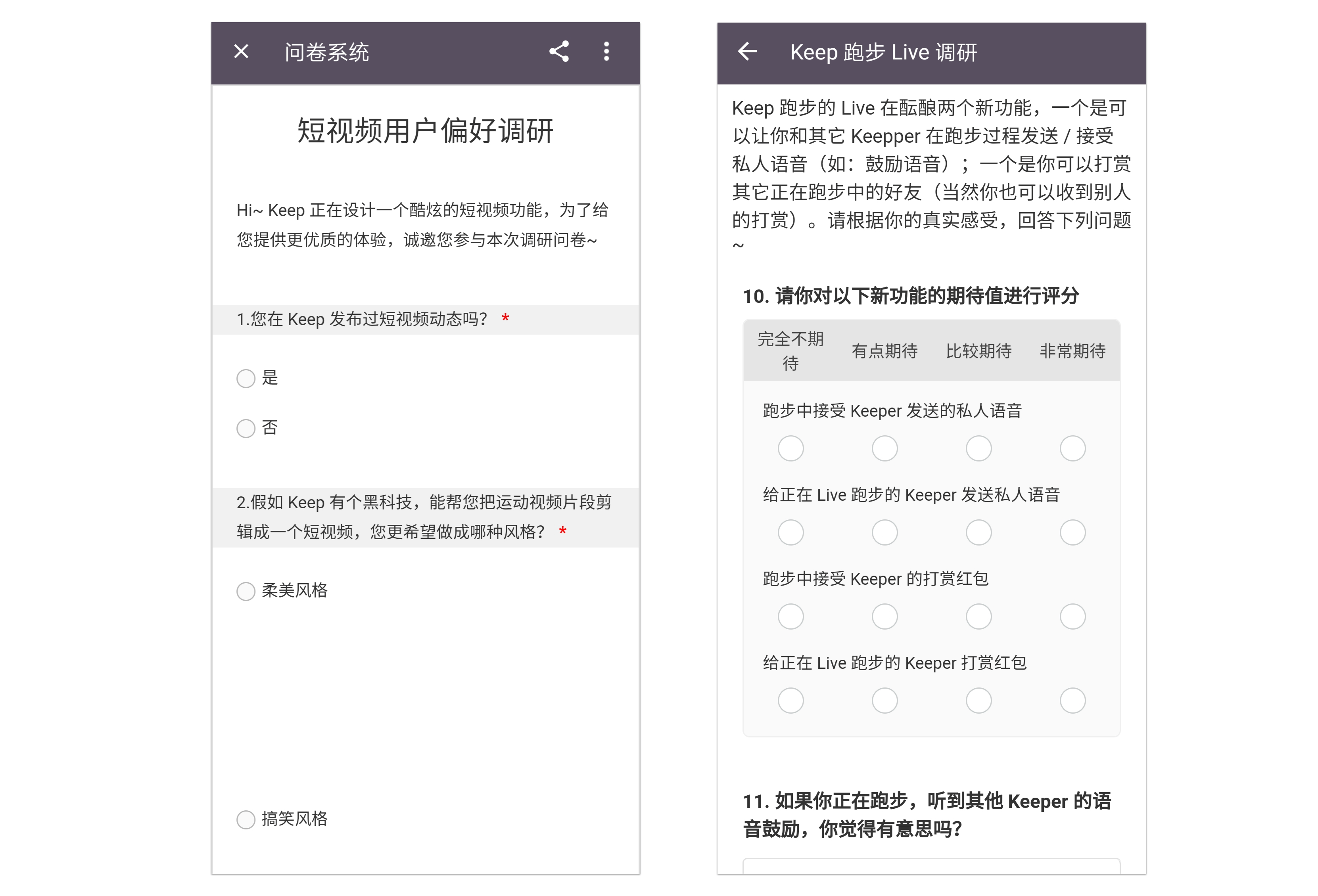 如keep在18年5月份的时候提前调研用户对于短视频的态度,10月的时候上线了该功能,最近又在调研live打赏功能,调研结果如何就看之后会不会上线了。