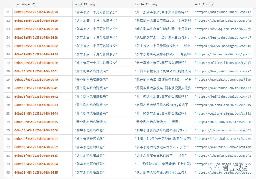 我们仍然按照上面同样的步骤抓取数据,在这个过程中顺带保存每个词的搜索结果自然排名数据,即TOP10的标题和链接(我们当然也可以额外再多采集几页数据保存作为后期参考),把它们单独存放在一个表: