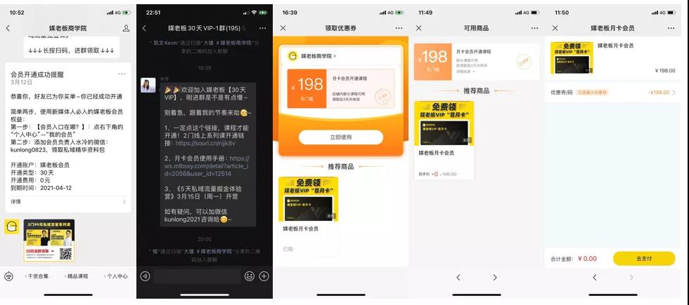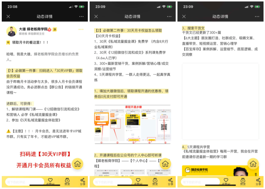 同时,新的种子用户进行裂变分享的"诱饵",依然是"30天的媒老板商学院VIP会员",也就是说,被第二轮吸引入群的用户,依然会是媒老板商学院的目标用户,因为这些用户在入群之前,是接触不到"100元的分销现金"信息的,他们只有可能是有培训需求,而被"30天的媒老板商学院VIP会员"吸引进群的。