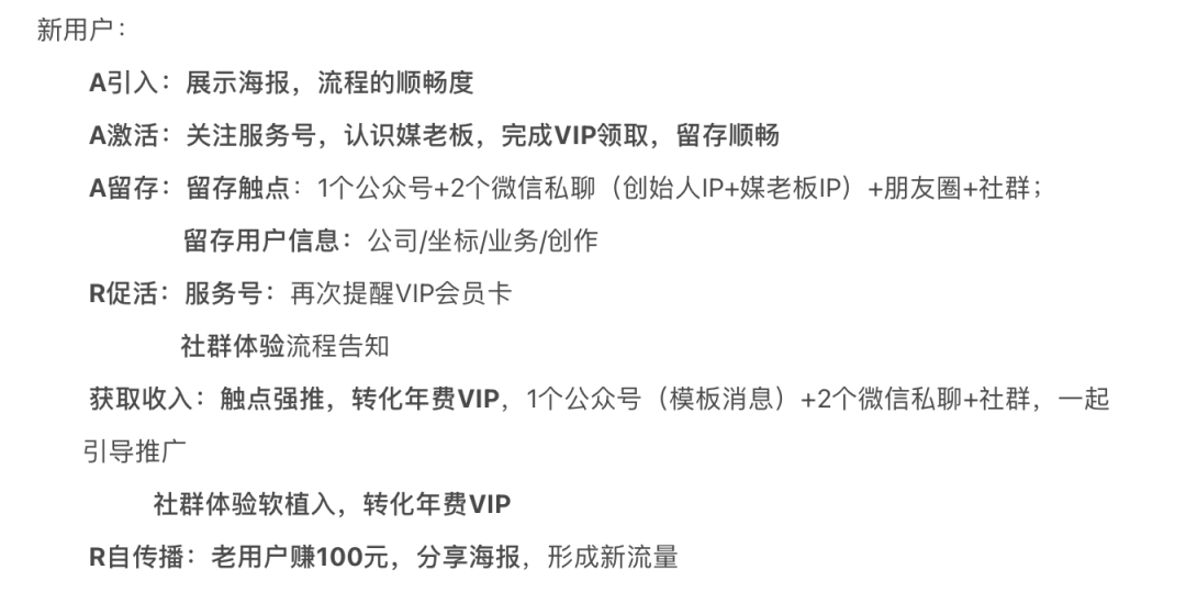 新用户:引入—激活—留存—促活—获取收入—自传播