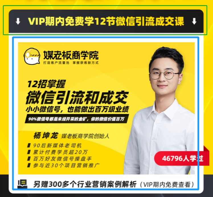 其次绿色框,VIP期间,免费学12节微信引流成交课