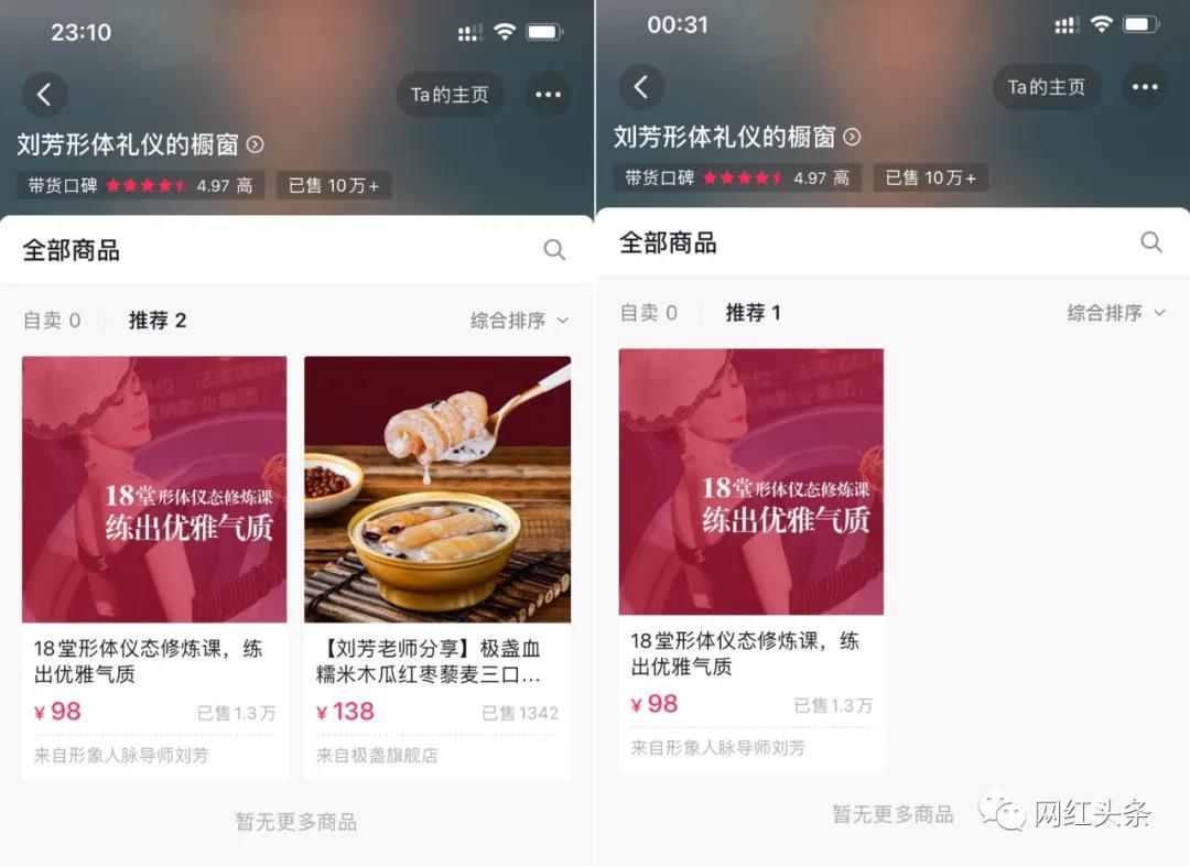 例如在某一日的23点左右,除了视频课橱窗内还有一款食品销售。但是直播结束后,大约过了一段时间,该商品就被下架了。