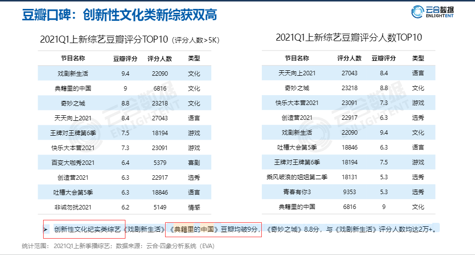 虽然文化类综艺的有效播放数不及游戏,能破圈的综艺档数也不多,但是创新性的文化新综艺在豆瓣上的评分获得双高,其中《戏剧新生活》和《典籍里的中国》在豆瓣上的评分均破9分,好评如潮。