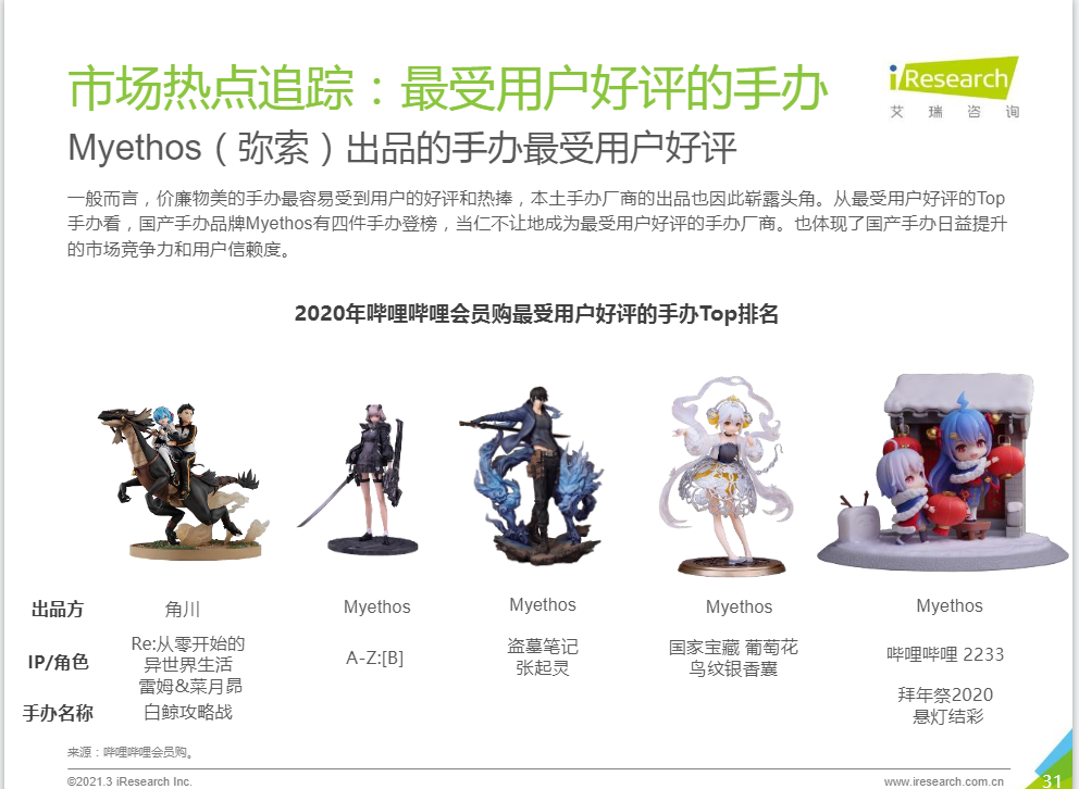 如下图艾瑞报告数据所示,2020年哔哩哔哩会员购手办销售排名中,就有国家宝藏的葡萄花鸟纹银香囊手办,这恰恰说明国产手办在日益提升着市场竞争力和用户信赖度。