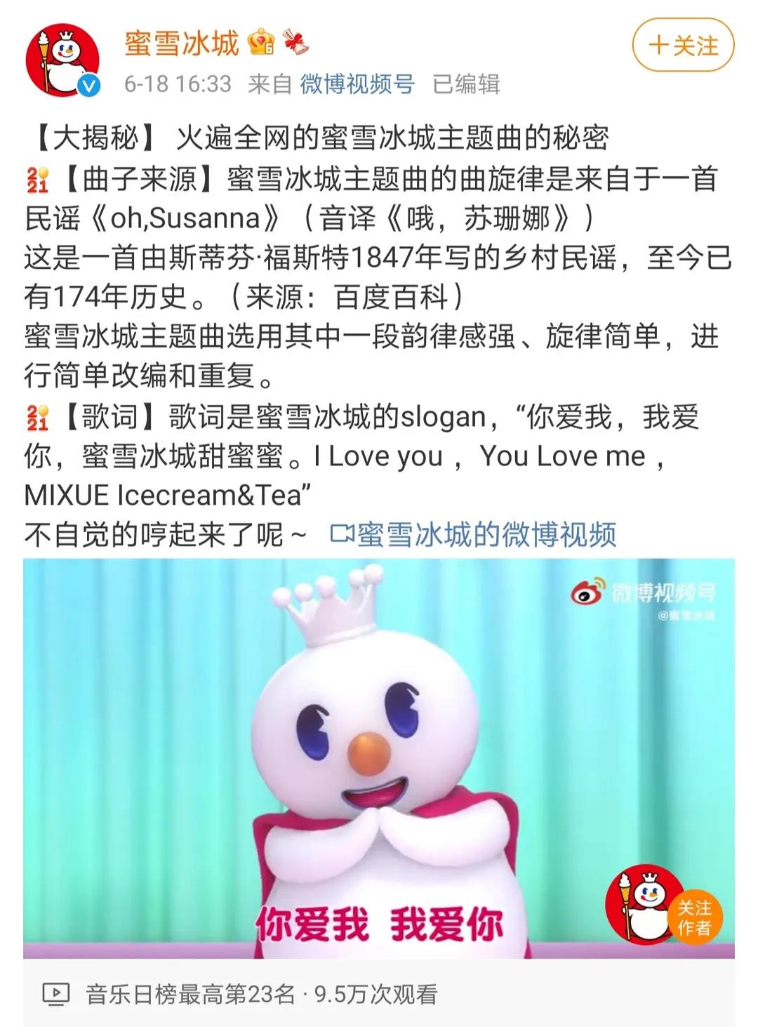 直到6月17日,@环球音乐榜 发布微博,帮助网友找到蜜雪冰城主题曲魔性的原因。歌曲改编自美国民谣《Oh Susanna》,原作本身就是朗朗上口、容易传播的旋律,只是我们对非母语的英文歌词很难有共鸣。