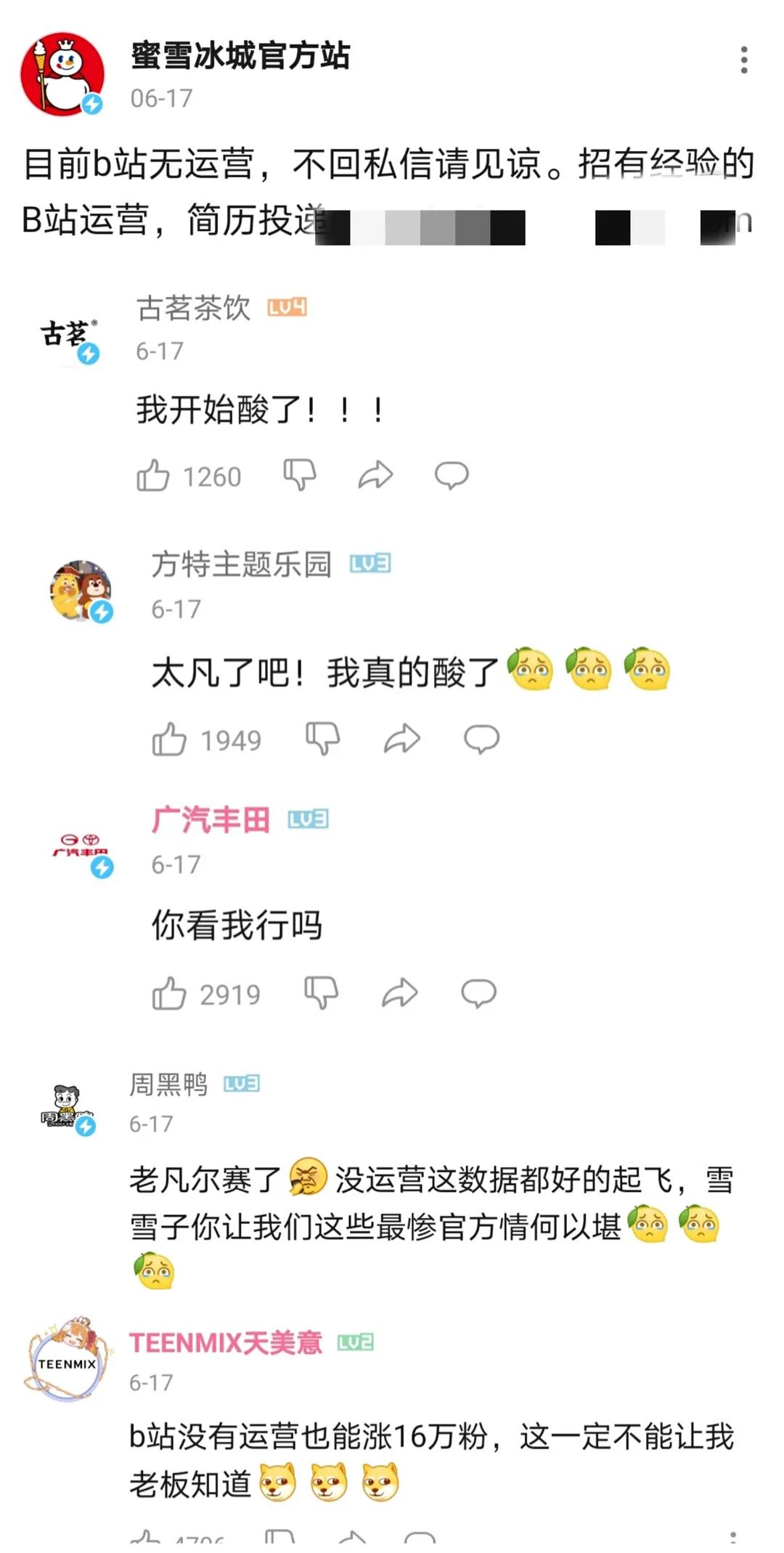 面对网友们的二次创作,蜜雪冰城也积极地给予了回应。在微博上连续转发网友的创作内容,激励了用户的创作欲。而且由于B站没有专门的运营,还在官方动态中直接发布招聘信息,不仅引起粉丝的关注,还引来众多品牌官方“羡慕”调侃。