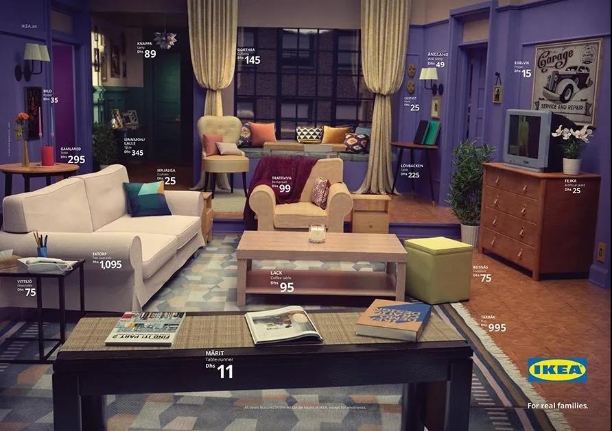 宜家作为家居品牌,与生活联系紧密,如何用营销让消费者感知"买家居上宜家"这个认知呢?宜家走进了美剧,发布了一组"Real Life Series"(真实生活系列)海报,用宜家的产品作为"道具",还原了3部经典影视剧《老友记》、《辛普森一家》、《怪奇物语》的家庭场景。