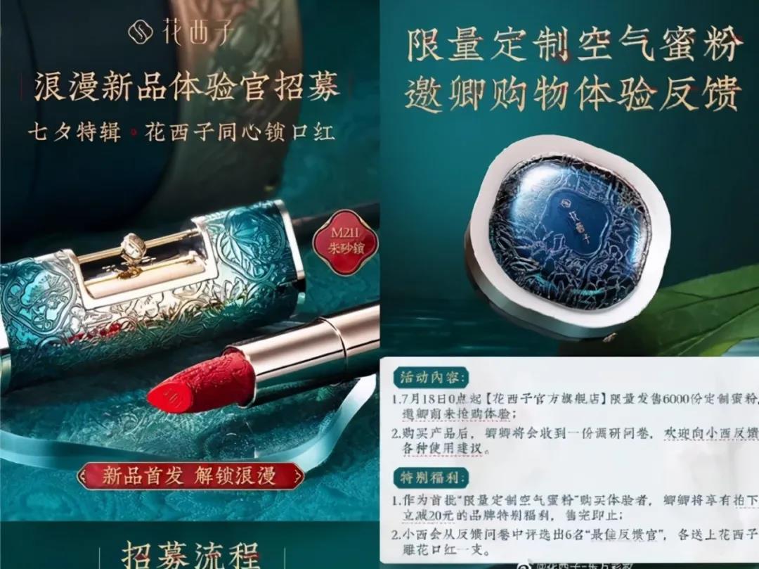 更难能可贵的是其一以贯之。2017年8月,花西子入驻天猫开设品牌旗舰店,同月首次在品牌官微和微信发布"彩妆体验官招募令",邀请用户参与6款产品的"内测"。并不仅仅是噱头形式,花西子基本上每款产品都是经由"内测"诞生。如今,花西子已经拥有超过10万名产品体验官。