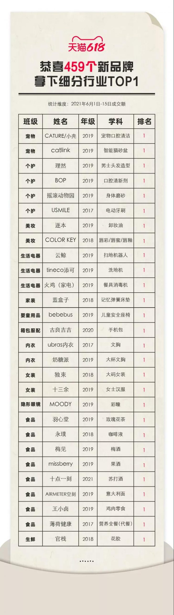 男装行业的新起之秀,BEASTER 在618预售阶段销售金额位列男装行业 TOP1;新品牌小鹿蓝蓝在618首日成交近400万,溶豆卖出超2万件,位居宝宝零食类目TOP1;Ubras继续保持上进的势头牢牢占据内衣品类的TOP1,预售一开始就突破了亿元大关……据天猫公布的数据显示,按6月1日至15日的销售额计算,共有459个新品牌拿下天猫618细分行业的TOP1。