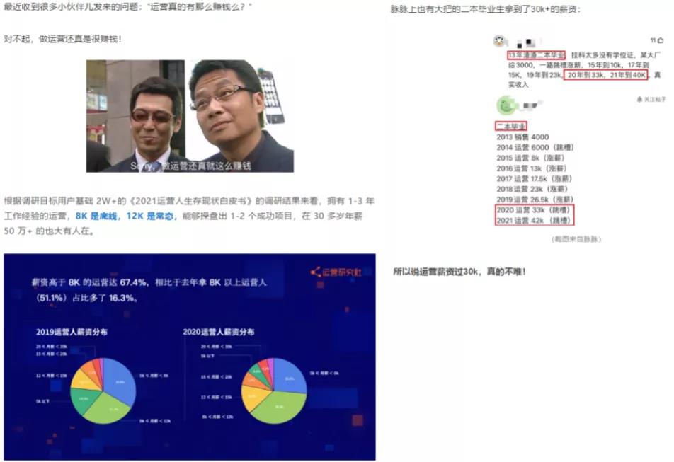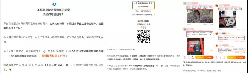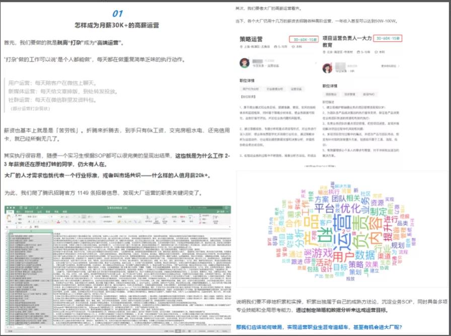 然后,告诉用户什么样的人能够获得30K,怎样去获得30K,内容通过共鸣,击中大部分运营人的现状和痛点。例如:做SOP的执行人、打杂、上班几年薪资原地打转;