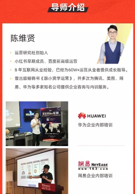 小贤曾出版畅销书《跟小贤学运营》(没错,跟课程是一个名字),是数万运营人的启蒙之作。并多次为腾讯、华为等知名大厂提供企业咨询和内容服务。