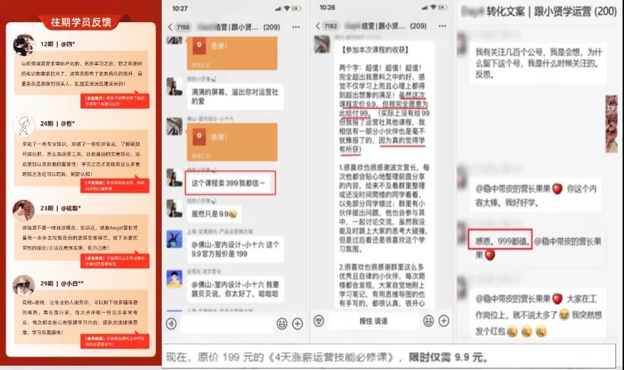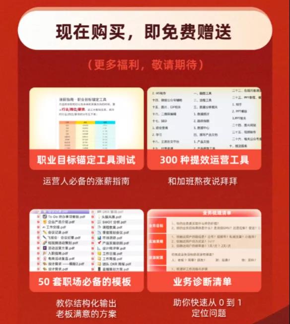 知识:系统学习活动策划、转化文案、社群运营、数据分析 4 个通用且重要技能课程, 收获 1 套系统成长方案 + 4天高质量社群服务 + 1V1 职业规划&加薪指导
