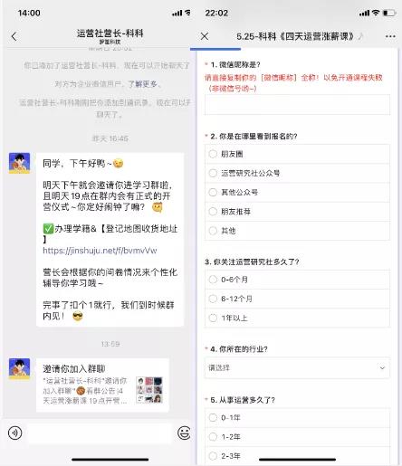 流程:报名成功加班主任微信→告知开营时间&用户信息调查