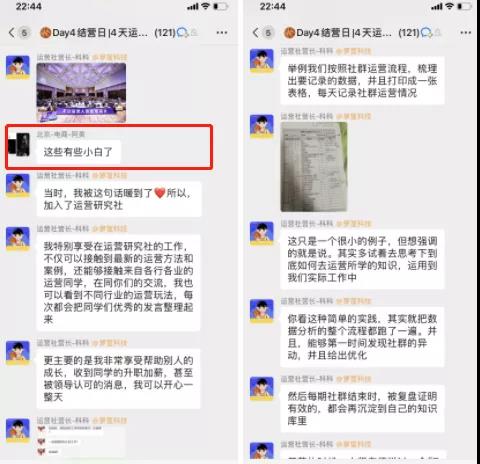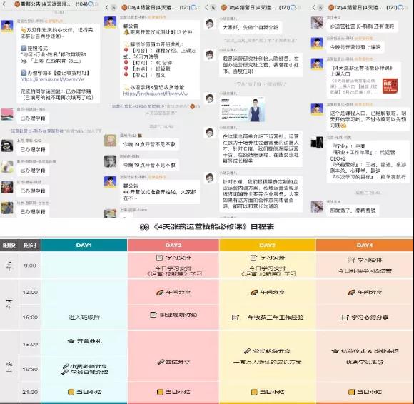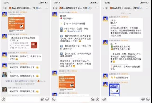 ①班主任根据日程表进行活跃,早上发布学习安排,中午干货文章分享,下午话题讨论,晚上班主任进行不同主题分享。课程活跃中,不停的抛出福利钩子,引导用户完成听课内容,并做好笔记输出。