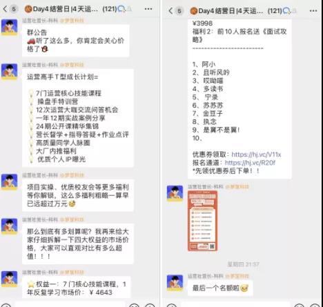 第三天晚上已经开始转化,采取拼团方法来解锁优惠福利,用户可以领取优惠券并下单。群内不断有用户晒图,增加用户从众感,促进下单转化,同时班主任不断更新名额,增加紧迫感,但群内托有点太过明显。