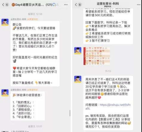 第四天基本已经结束,晚上结营再发优惠券转化一波,周日班主任发布学习反馈,以福利钩子收集学员反馈,为优化SOP流程做准备。