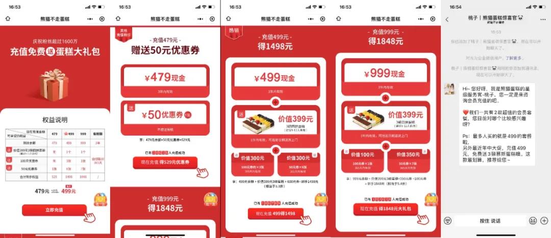 第三,充值999元,赠送价值399元的3镑的四拼慕斯蛋糕,1张100元优惠券和7张50元优惠券,合计到手权益1848元。