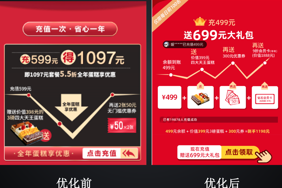 黄剑锋:第一,此前,充值详情页的转化率只有0.35%,优化后转化率为5.8%,效果增长了1557.14%。优化详情页的要点可总结为四点:1.制造稀缺,加入每日限量的提示;2.展示畅销,展示充值人数;3.痛点刺激,加入场景对比;4.展示好评内容。