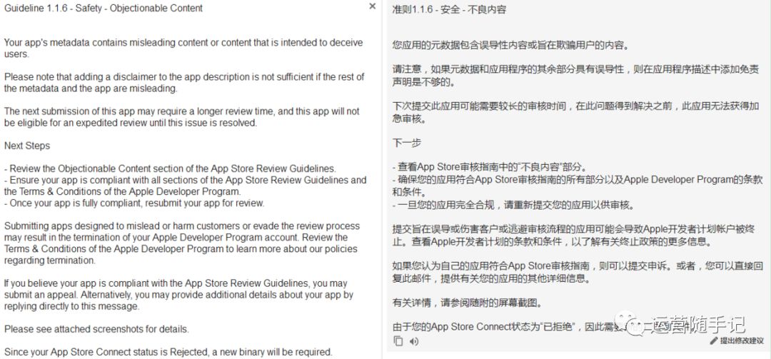 第一种目的的大部分应该是游戏类应用,其中传奇、仙侠、三国等类型的游戏又是买量的主力,在苹果机审不断升级的情况下,过审难度越来越大,根据笔者的观察,几个月前苹果机审对于一些重点关键词的审核把控还没那么高,现在如果应用涉及到了一些重点关键词,可能会收到被拒的反馈,具体反馈内容如下图所示,所以以买量为目的的APP最好还是填入一些常规关键词即可,以助于过审。