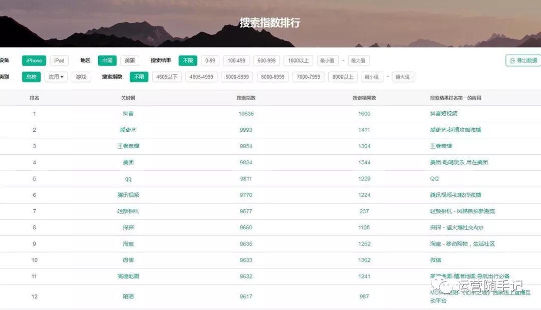 我们通过七麦数据、CQASO等网站的搜索指数排行可以看到如图所示的排行,分别为关键词的排名、搜索指数和结果数,然后我们选中排名前200词中的一些词,进行简单的组合拼凑,可以得出如“相机日历天气”、“借钱理财计算器”等组合词,然后依次填入我们100字符的关键子域里即可。