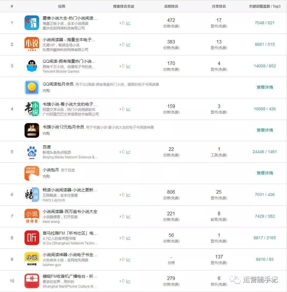 首先我们需要先找准产品定位,产品属于什么类型,比如直播、小说、相机类等等,然后确定关键词的范围。现在比如我们准备填写一个小说类应用的关键词,我们先搜索“小说”这个关键词,然后找到排名前十名的应用,如下图: