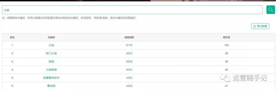 如果我们拿不准我们选出的关键词和我们APP是否有关联,可以通过“关键词扩展助手”功能进行查询。我们在搜索框内输入“小说”,然后“ctrl+f”,全局搜索是否有我们选中的关键词,这样我们就可以留下一批搜索热度高、相关性高的关键词。