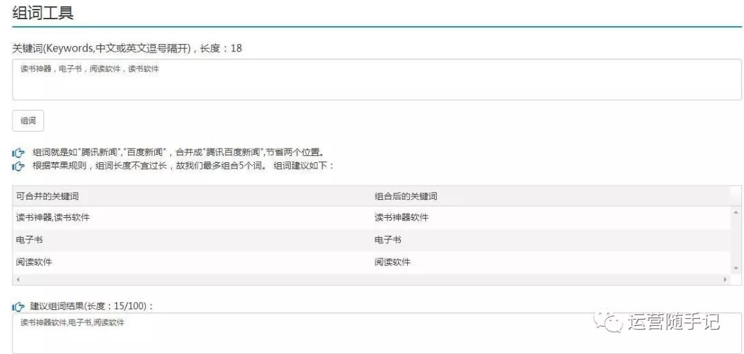 可以看出系统帮我们把“读书神器”和“读书软件”合并成了“读书神器软件”,这个操作我们就称为组词,因为重复的词对于我们覆盖关键词来说是没有帮助的,而且关键子域内只能填入100字符,所以我们需要进行组词来让收益最大化。
