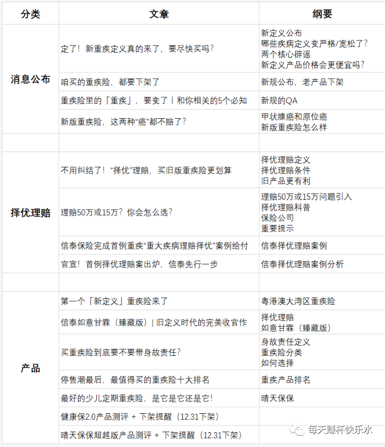 比如在21年初,重大疾病的定义有了新的变动,在这个变动下很多旧的产品会大批量停售,基于这样的情况,在消息通知、用户常见问题、产品推荐方面,保险自媒体机构便做了很多文章的输出宣传。