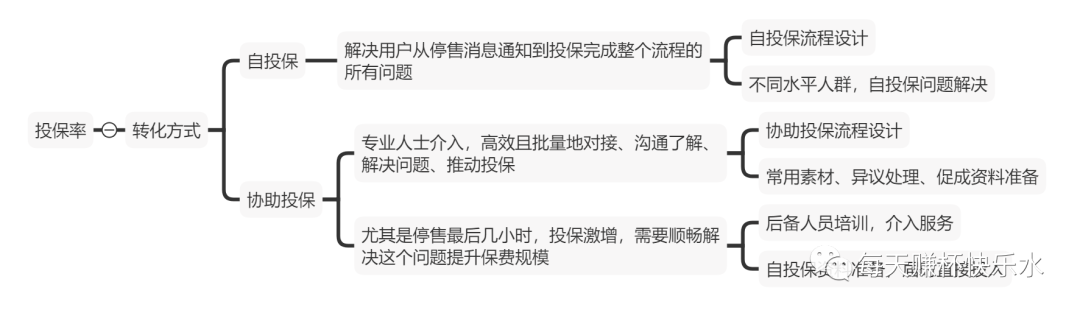 第一块是保险顾问介入,高效且批量地对接、沟通了解、解决问题、推动投保,这里的决定性因素在于保险顾问。运营可以做的就是协助提升整个流程的效率,在常用素材、异议处理、促成资料、活动转化方面提供销售支持。