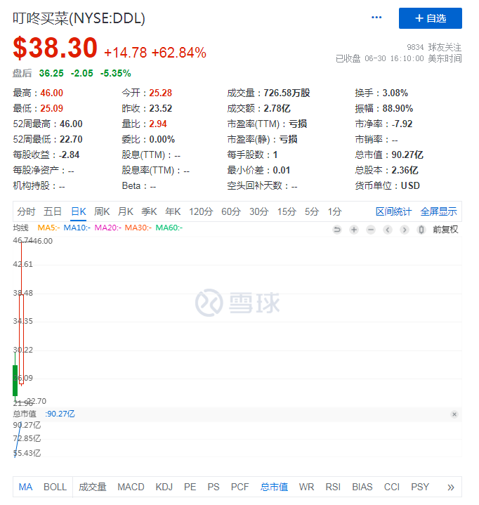 北京时间6月29日晚上,叮咚买菜正式登陆纽交所,发行价为23.5美元,收盘时上涨0.09%。尽管盘中出现短暂破发,但好在最终市值稳定在了55.43亿美元。而三天前(6月26日),同为生鲜电商扛把子的每日优鲜挂牌纳斯达克后,却经历了三连跌,以低于发行价32%的9.66美元收盘,25.69%的收盘跌幅创下了2021年赴美国上市的中国公司首日最大跌幅记录。