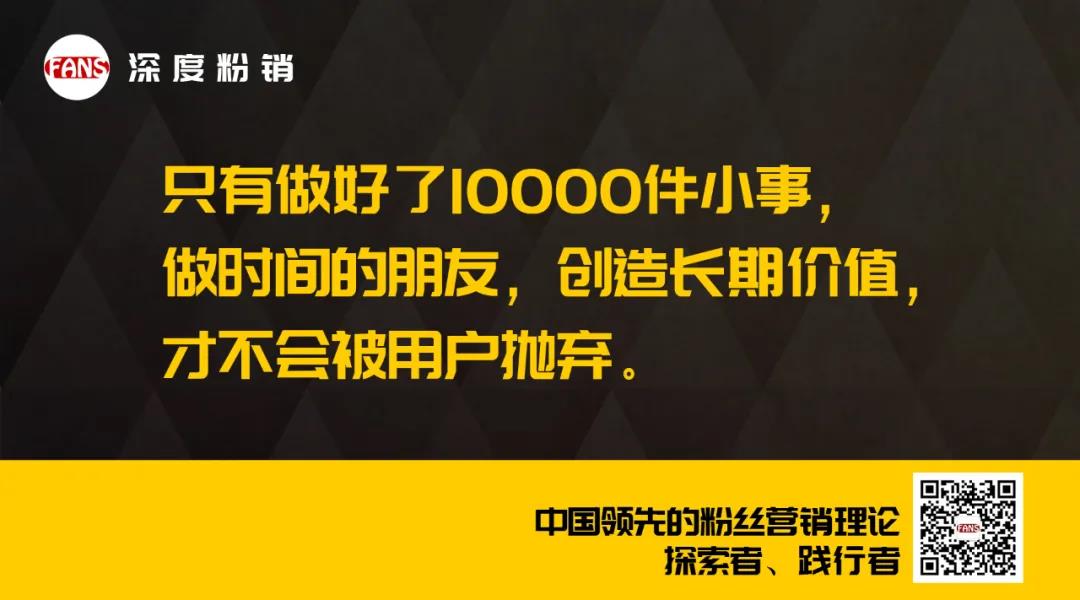 这些小事看上去微不足道,但却是用户运营中最基础却最至关重要的一环,也是我常说的三大粉丝思维之一——极致思维。所谓极致思维,就是不断坚持高标准、严要求地为顾客创造超过预期的价值,从而为品牌带来大量关注和粉丝。对任何企业来说,打造极致的产品和服务都是必须夯实的基础。