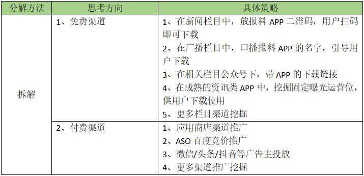 通过拆解的方法,我们轻松的将拉新策略拆分成2个方向——免费渠道拉新、付费渠道拉新。