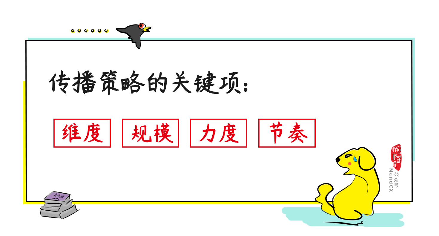 看到这里不难明白,传播策略需要考虑的因素其实有很多,你首先需要掌握维度、规模、力度和节奏这4个大的关键项,明白这几个关键选包含的内容和他们之间的关系,然后在具体策划传播策略时根据实际情况从这四个方向考虑和思考就OK了。