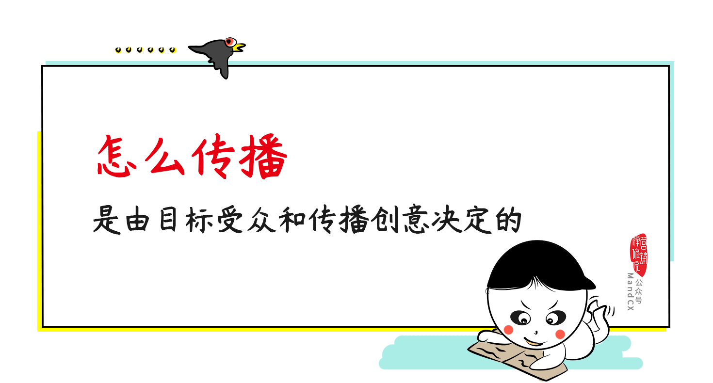 这个不说相信你也明白,就比如你的受众是Z世代人群,那就不可能电视、广播、报纸老三套传播,也不可能说什么耀世、绽放,而是cdx、nmsl等的沟通方式(MandCX),媒介的选择也是根据人群的触媒习惯和偏好来选择的,说白了就是受众在哪里传播就在哪里,见人说人话见鬼说鬼话。