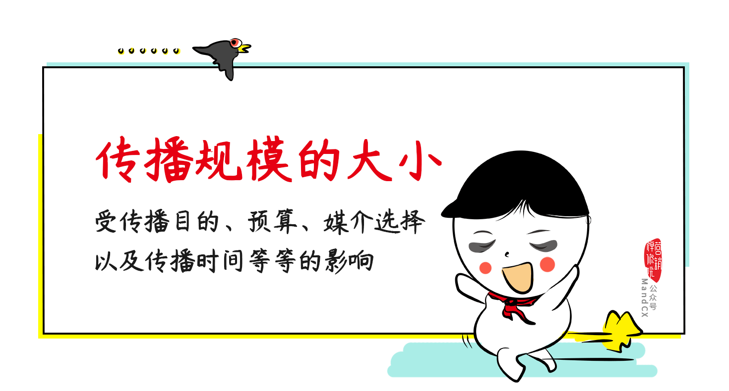 传播规模的大小受传播目的、预算、媒介选择以及传播时间等等的影响。