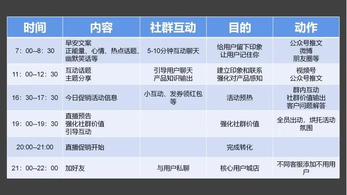 上面这个表格呢,是把社群三种类型的活动,浓缩到一天之中。当然在实际运营过程中,根据行业不同,是可以把时间轴拉长的。这里我只是为了方便说明。