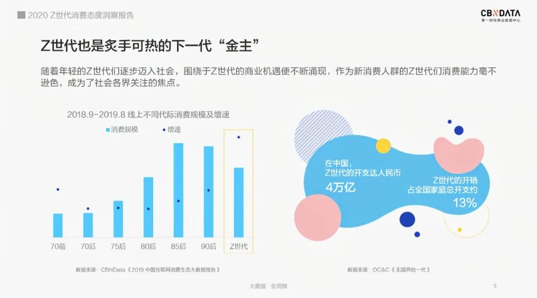 2020年一整年,Z世代被广泛提及,也成了最具前景的消费群体,据调查,Z世代在美国消费者的40%以上,每年购买力预估为440亿美元;在中国市场,随着中国经济的腾飞,"差值红利"带来的好处,造就了Z世代更高标准的消费需求、意愿、实力,他们也被誉为最敢花的一代。根据CBNData《报告》显示,我国Z世代开支达4万亿人民币,其开销约占全国家庭总开支的13%,消费增速远超其他年龄层。