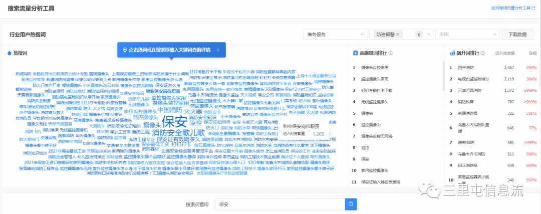 - 行业用户热搜词:查询客户所在的行业下,用户都在搜什么词,什么词跑量最高,什么词搜索量涨幅高;在选择的一级、二级行业下(也可根据需求选择国内地域),添加热搜词中字体较大的词、高跑量排行较高的词、飙升幅度较大的词