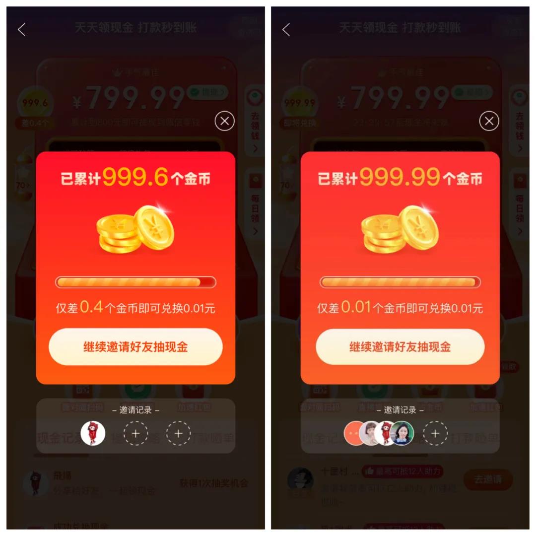 套路二金币助力:等你筹集到799.99的时候,只有1000金币才能兑换0.01元。所以官方会先让你很容易获得999.1的金币,每邀请一个好友助力获得0.1个金币。