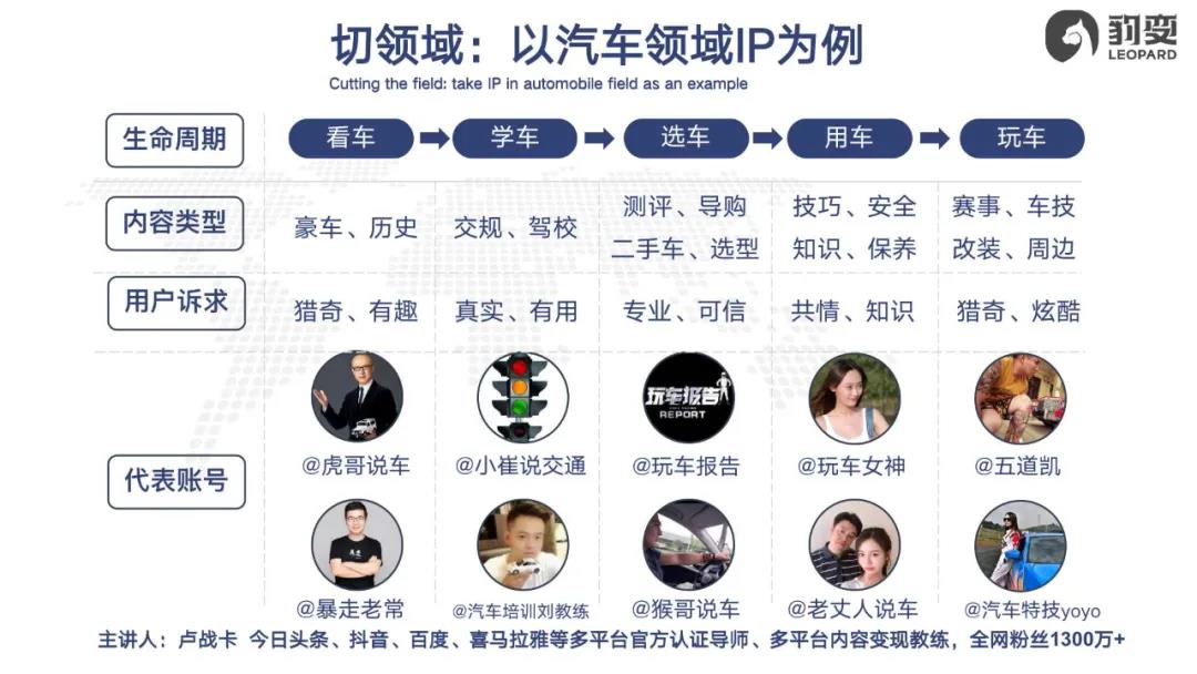 以汽车领域IP为例。光一个汽车IP,就可以细分为看车类、学车类、选车类、用车类、玩车类。